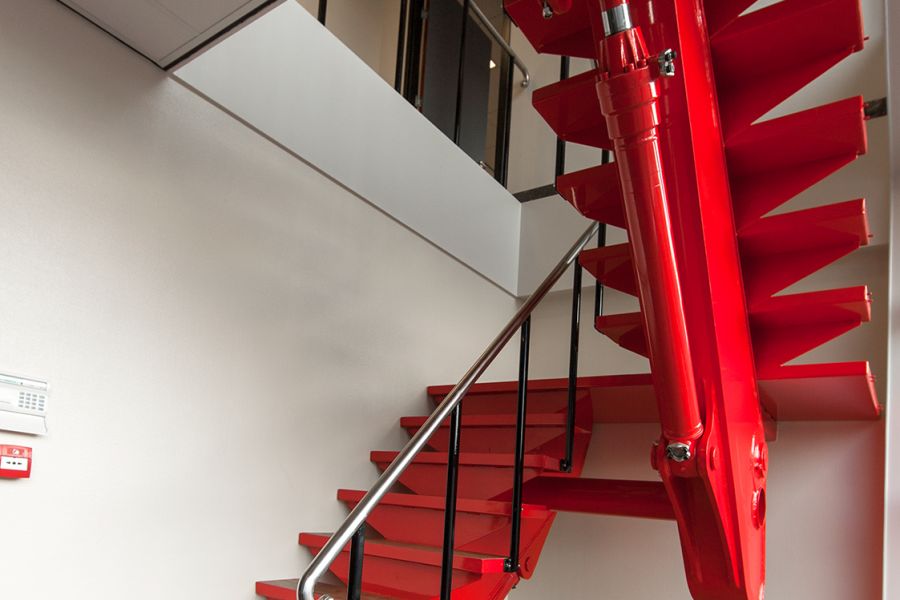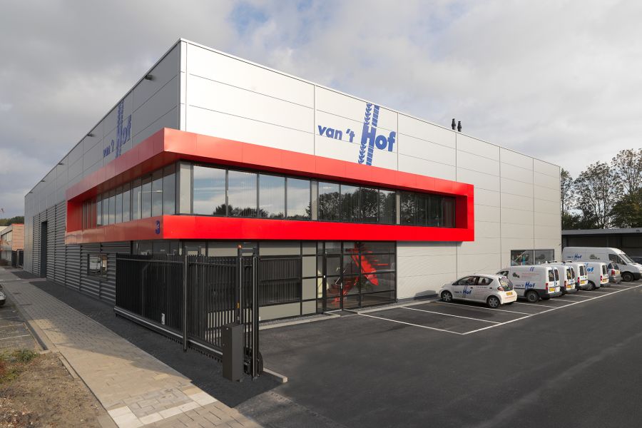 Hoofdkantoor Van ‘t Hof Techniek, tevens onderhoudswerkplaats voor Grondverzetmachines. Voor de boom van de trap een Giek van een graafmachine gebruikt.